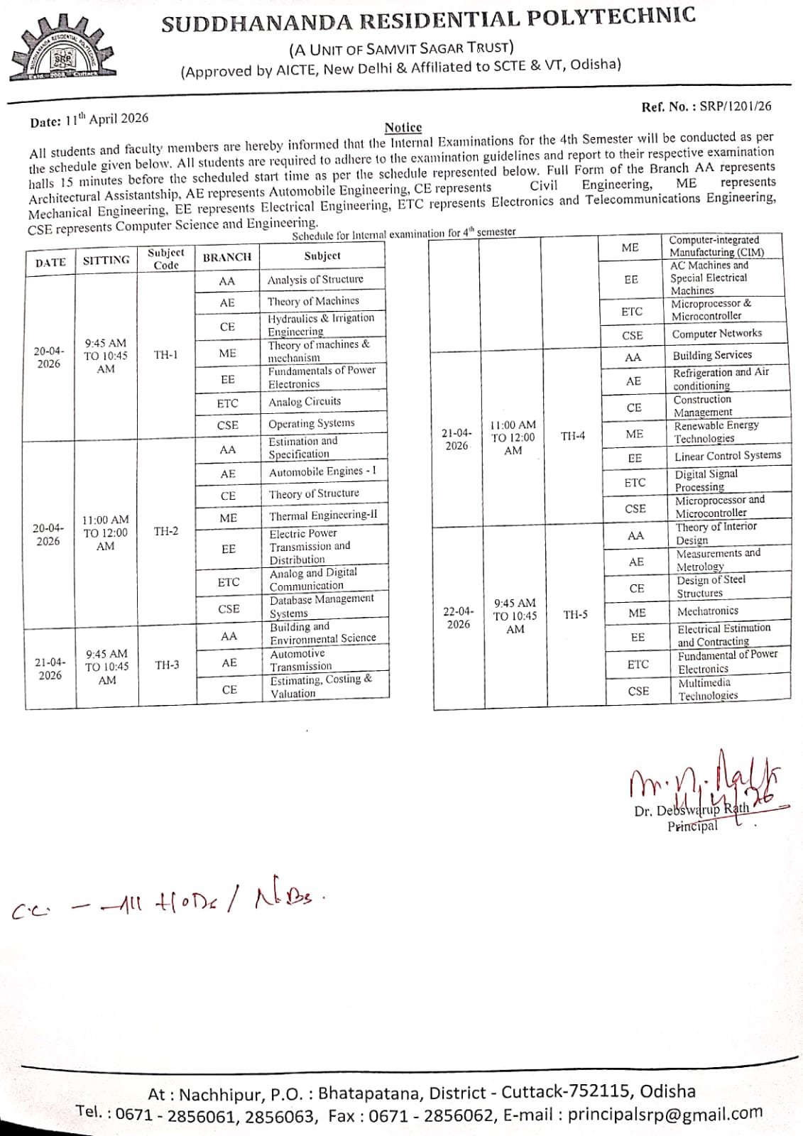 All students and faculty members are hereby informed that the 2nd Internal Examinations for the 4th Semesters will be conducted as per the schedule given below. All students are required to adhere to the examination guidelines and report to their respective examination halls 15 minutes before the scheduled start time as per the schedule represented below. Full Form of the Branch AA represents Architectural Assistantship, AE represents Automobile Engineering, CE represents Civil Engineering, ME represents Mechanical Engineering, EE represents Electrical Engineering, ETC represents Electronics and Telecommunications Engineering, CSE represents Computer Science and Engineering.